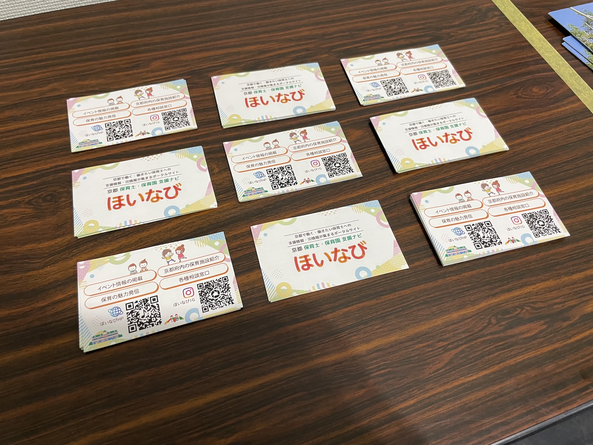 資料コーナーでは、多数の園の資料をまとめて収集できるため、参加者は合同説明会の合間に各園の資料を収集していました。ほいなびの名刺カードも置かせていただきました。