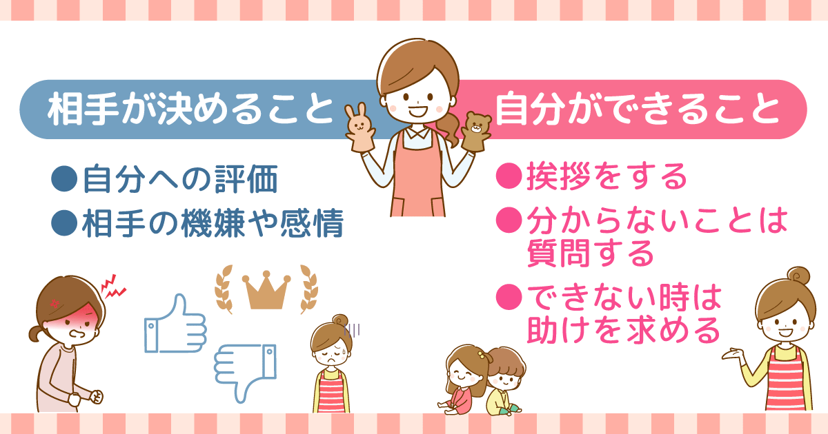 しかし、ここで一度立ち止まって考えてみてほしいのは、「自分でコントロールできること」と「できないこと」の違いです。「相手が自分をどう評価するか」「どのように感じるか」は相手が決めることであり、自分では変えられません。一方で、自分ができることははっきりしています。