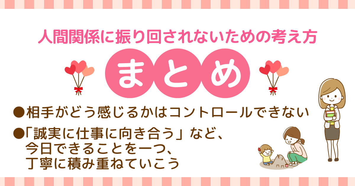共通して言えることは、「人間関係の苦しさは『相手を気にしすぎてしまうこと』から大きくなりやすい」ということです。相手がどう感じるか、どう評価するかは相手の課題であり、自分がどのように行動するかは自分の課題です。まずは、自分ができることに意識を向け、着実にやるべきことを積み重ねていきましょう。