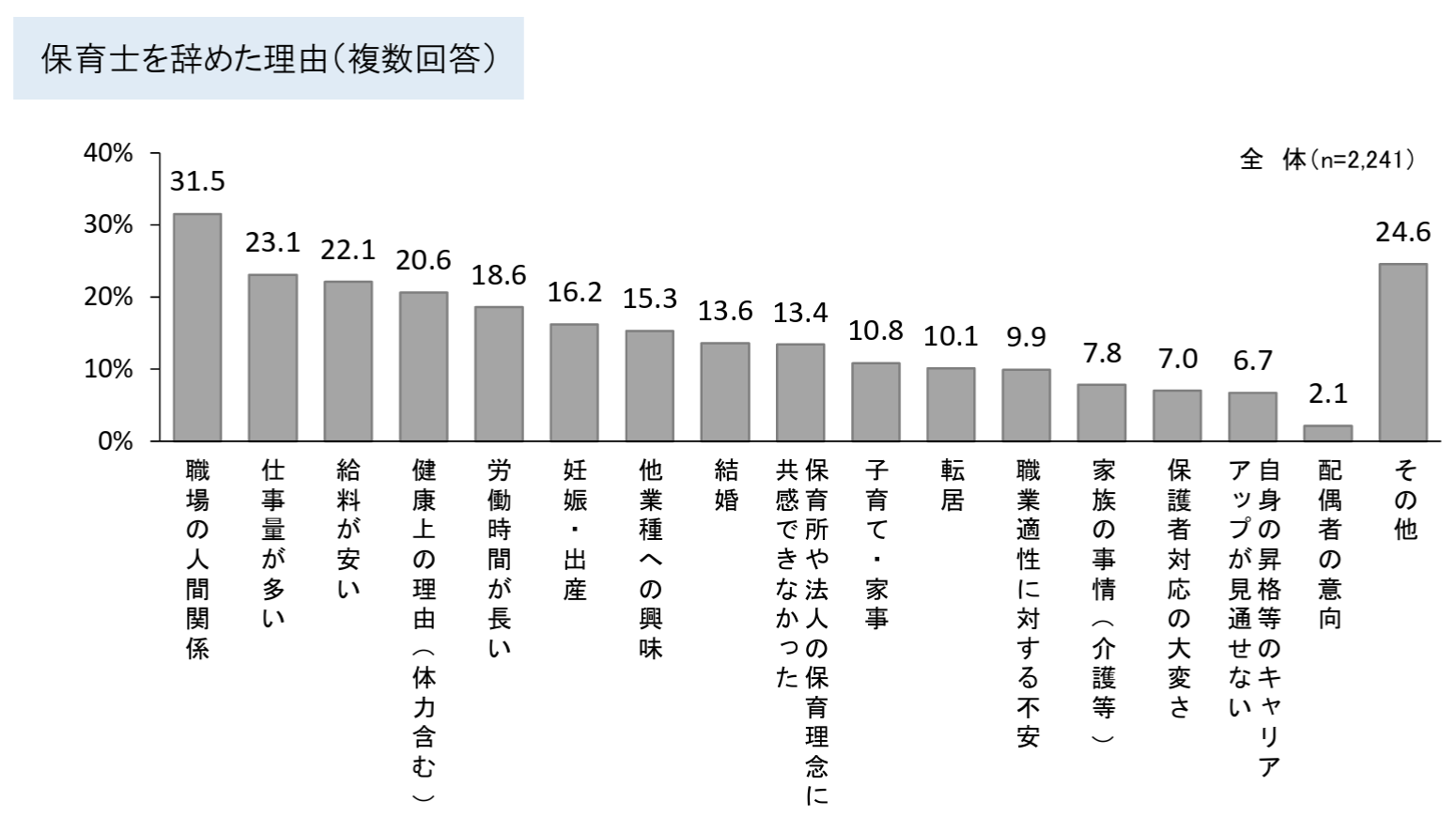 保育士として就職や復職を考えるとき、多くの方が不安に感じるのが「人間関係」です。職場に馴染めるだろうか、どう思われているのか、うまくやれていないのではないか——。こうした悩みは、決して特別なものではありません。実際に、東京都が令和4年度に行った保育士の実態調査によると、保育士の離職理由の第1位として「人間関係」(31.5%)が挙げられています。